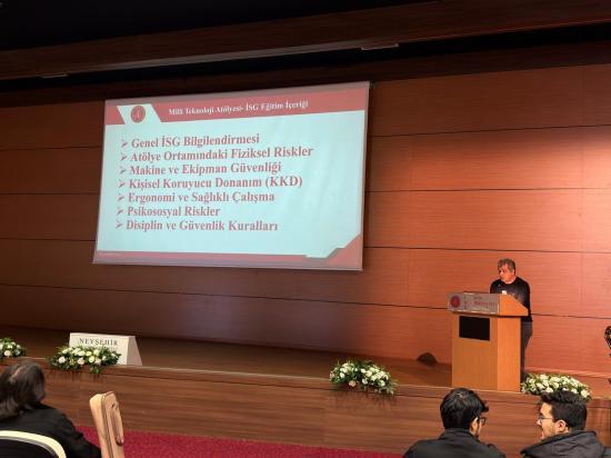 5 Mart 2026 tarihinde NEVÜ Kongre Merkezi’nde gerçekleştirilen eğitim, İş Sağlığı ve Güvenliği Koordinatör Yardımcısı Öğr. Gör. Dr. Yunus Kara tarafından verildi. Programa bölüm öğrencileri yoğun ilgi gösterirken, atölye ortamında karşılaşılabilecek olası riskler ve güvenli çalışma kültürü kapsamlı biçimde ele alındı.